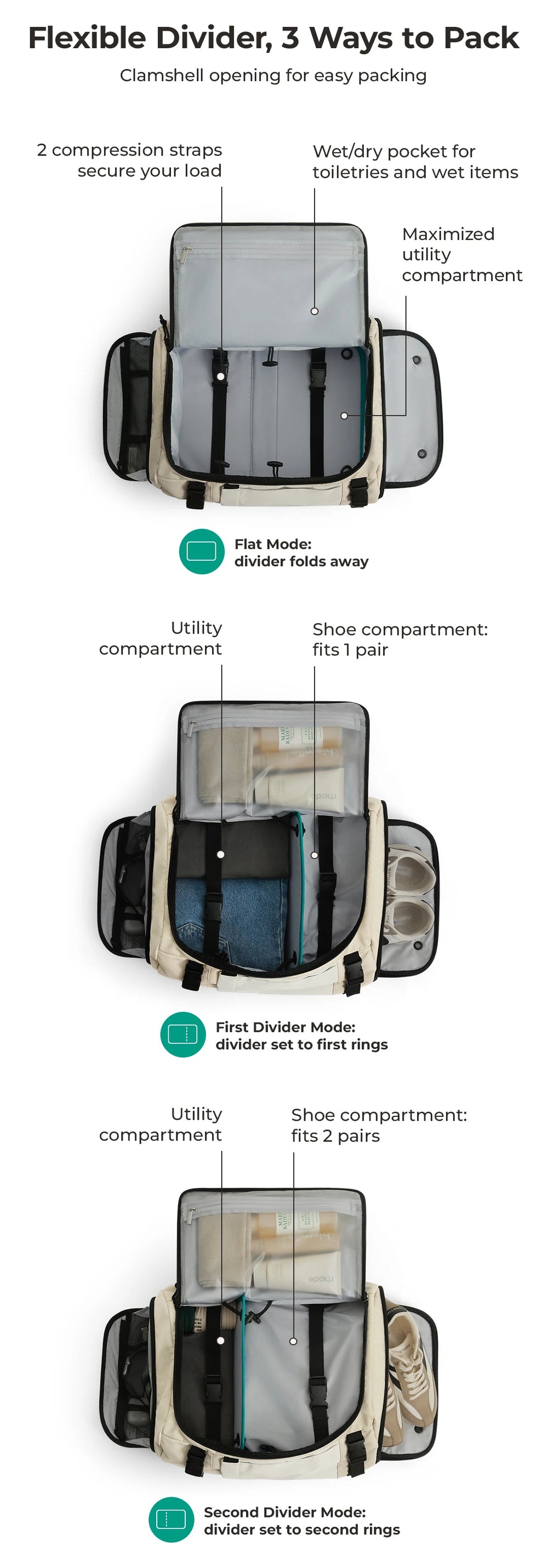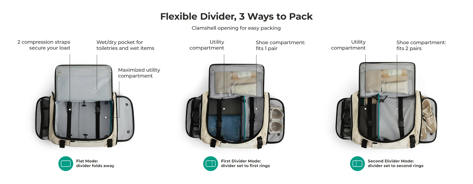- Two-level fold-flat divider panel separates shoes, clothes, or gear.