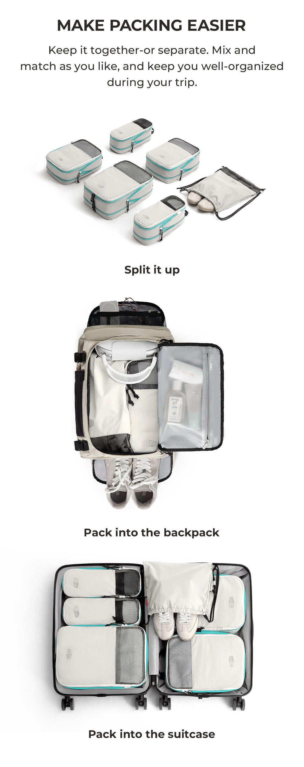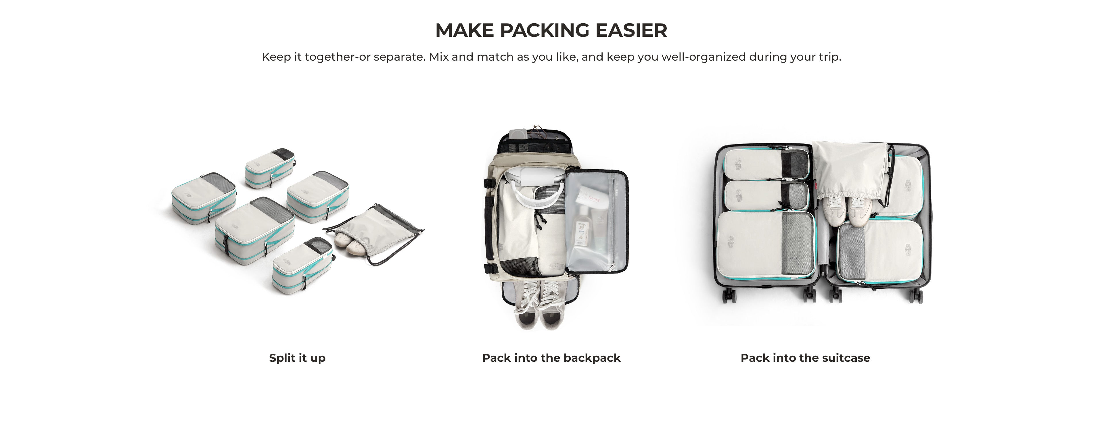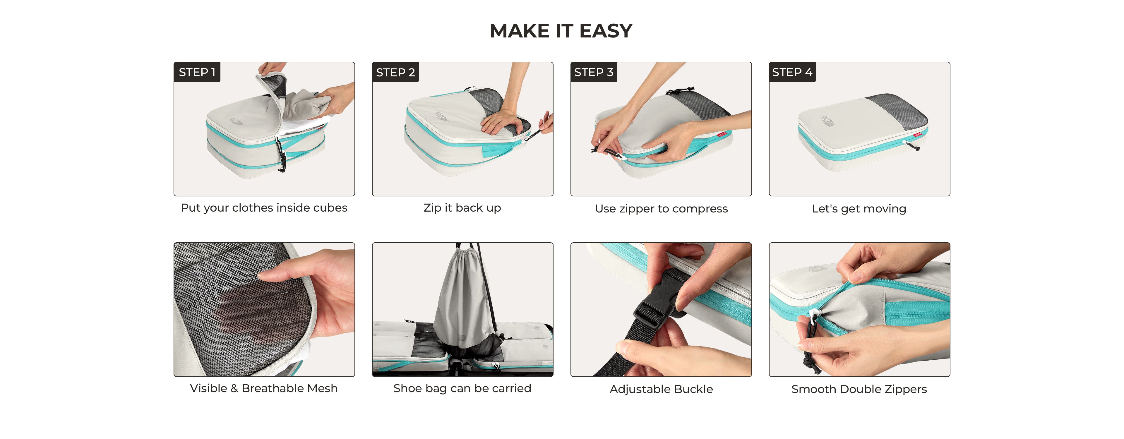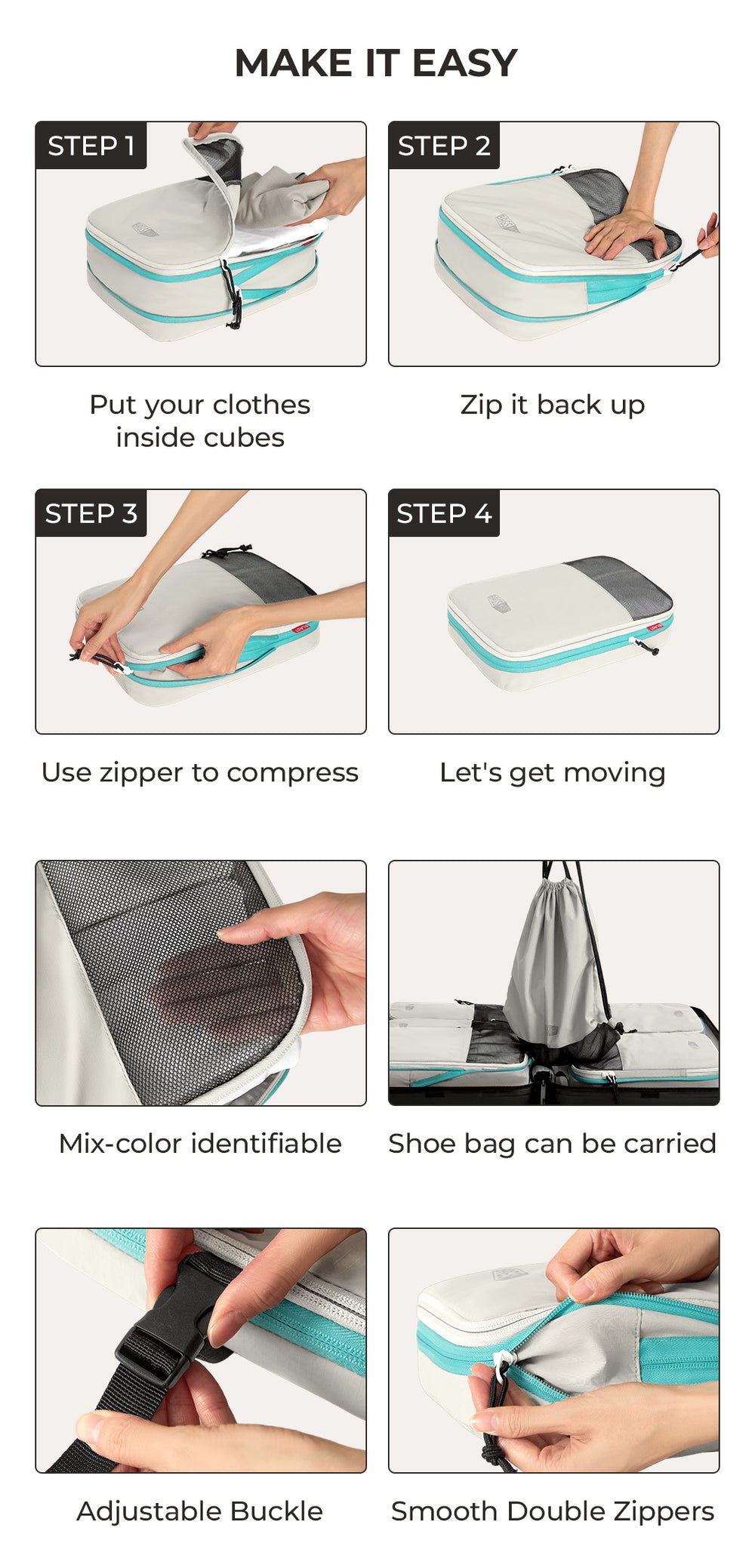- BLAST 6PCS CUBES DE VOYAGE DE VOYAGE DE COMPRESSION - Maximisez votre espace de bagages avec des fermetures à glissière de compression et des panneaux en maille respirant. Ces cubes d'emballage gardent votre essentiel soigneusement organisé, faisant des emballages et déballage sans tracas.